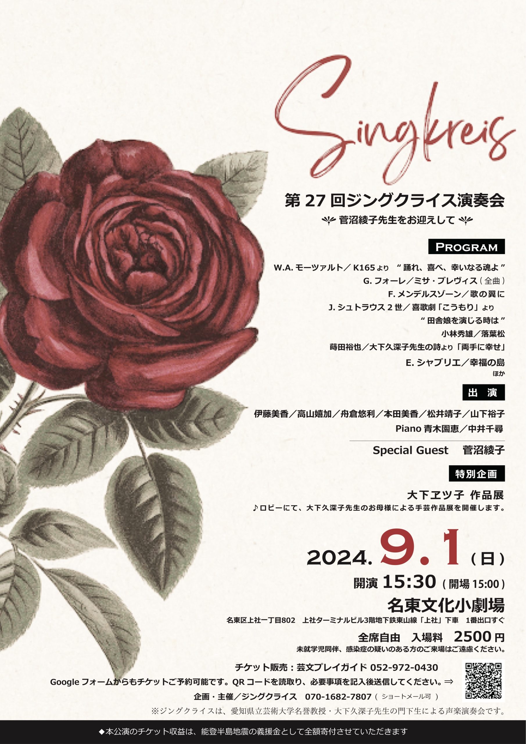 9/1(日)第27回ジングクライス演奏会 2024.08.20演奏会情報 HOME ブログ 演奏会情報 9/1(日)第27回ジングクライス演奏会 2024年9月1日(日)名東文化小劇場にて、大下久深子門下生による声楽コンサート『第27回ジングクライス演奏会』に伴奏ピアニストとして出演いたします。 今回は門下生のほか、大下先生と親交のあられた菅沼綾子先生をスペシャルゲストにお迎えいたします。どうぞ皆様、聴きにいらしてください。 第27回ジングクライス演奏会 Post 演奏会情報 9/7(土)宗次ホール ランチタイム名曲コンサート 3/16(日)Grün concert the 7th