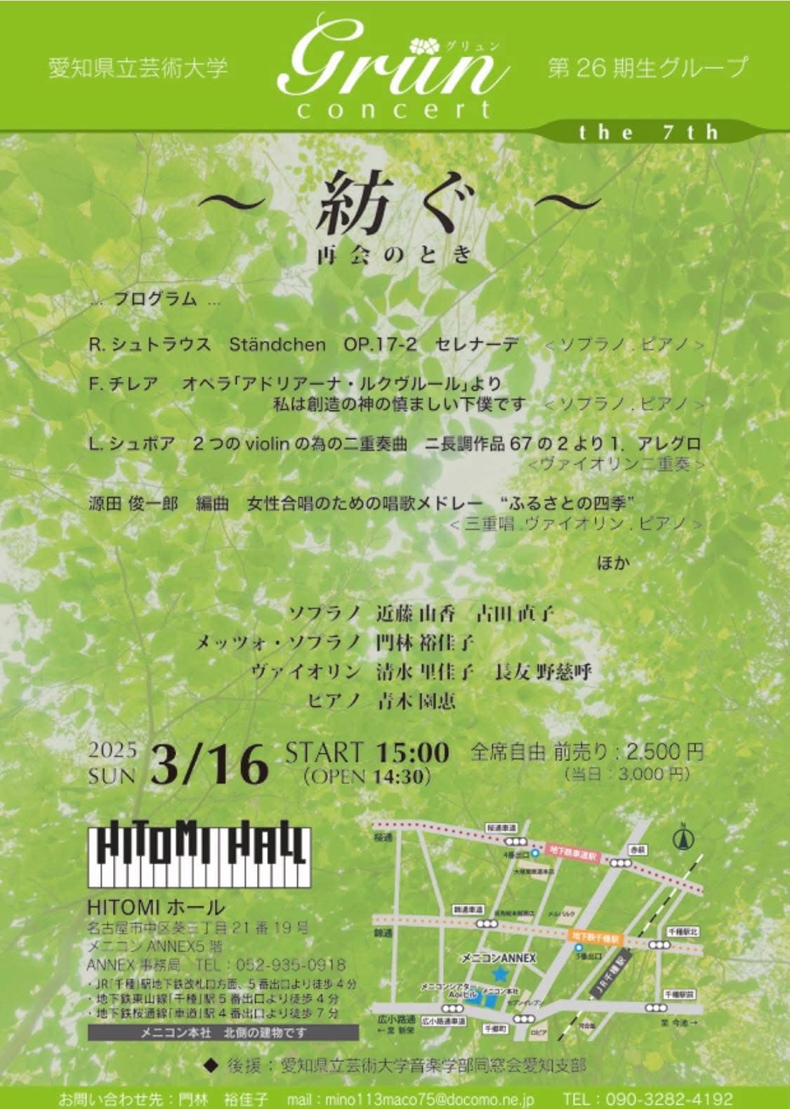 3/16(日)Grün concert the 7th 2025.01.16演奏会情報 HOME ブログ 演奏会情報 3/16(日)Grün concert the 7th 愛知県立芸術大学第26期生グループ「Grün」によるコンサート〜紡ぐ 再会の時〜を、3月16日(日)名古屋市中区葵三丁目21番19号「HITOMIホール」にて開催します。 お問合せは、門林裕佳子(090-3282-4192)、Grün音楽企画まで。 3/16(日) Grün concert Post 演奏会情報 9/1(日)第27回ジングクライス演奏会 2/15(土)椙山女学園大学第15回卒業生と教員によるコンサート