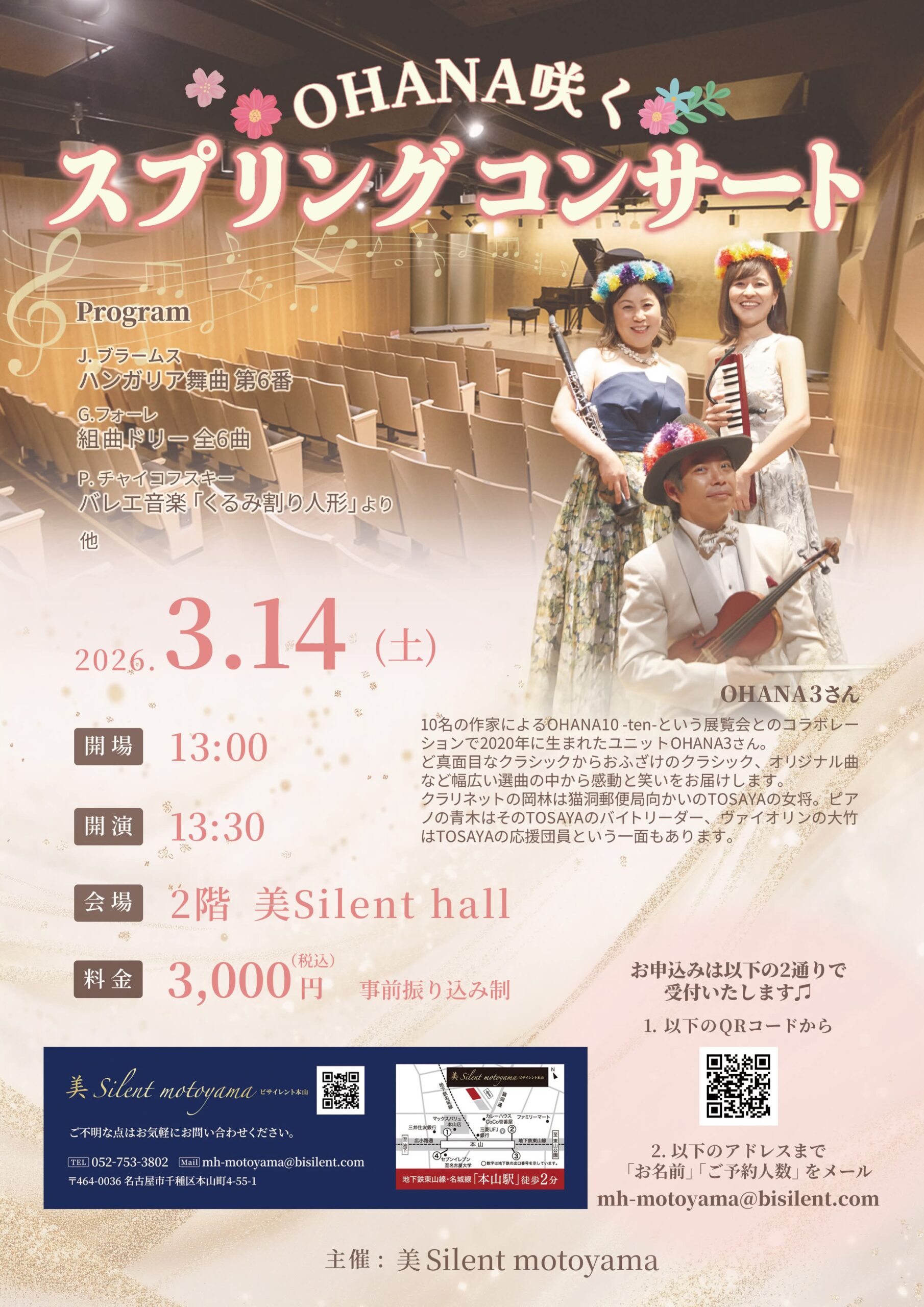 2026年3月14日(土) 名古屋市千種区本山町【美 Silent motoyama】にて、「美 Silent motoyama スプリングコンサート」に出演します。