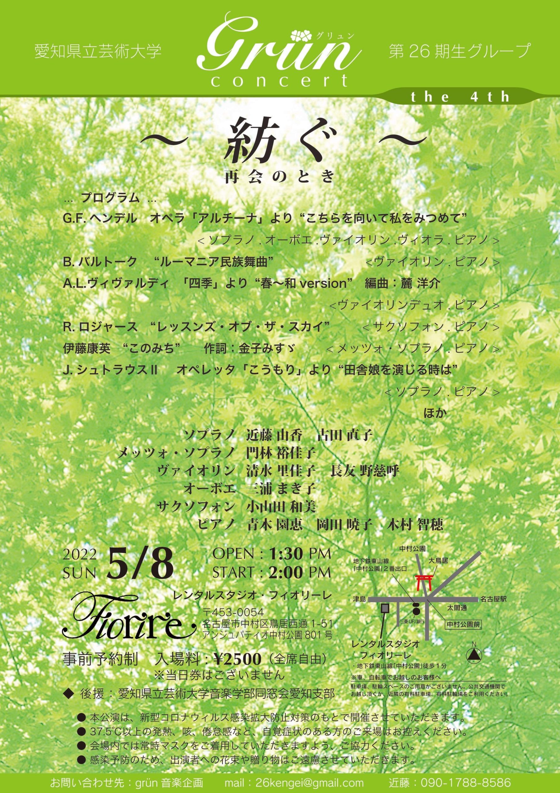 5/8(日)Grün concert the 4th 2022.04.01演奏会情報 HOME ブログ 演奏会情報 5/8(日)Grün concert the 4th 愛知県立芸術大学第26期生グループ「Grün」によるコンサート〜紡ぐ 再会の時〜を、5月8日(日)中村区レンタルスタジオ「フィオリーレ」にて開催します。 事前予約制となります。お問合せはGrün音楽企画まで。 Grün concert Post 演奏会情報 5/21(土)まるごと!!Piano!Piano! vol.2 7/2(土)4台のピアノによるコンサート