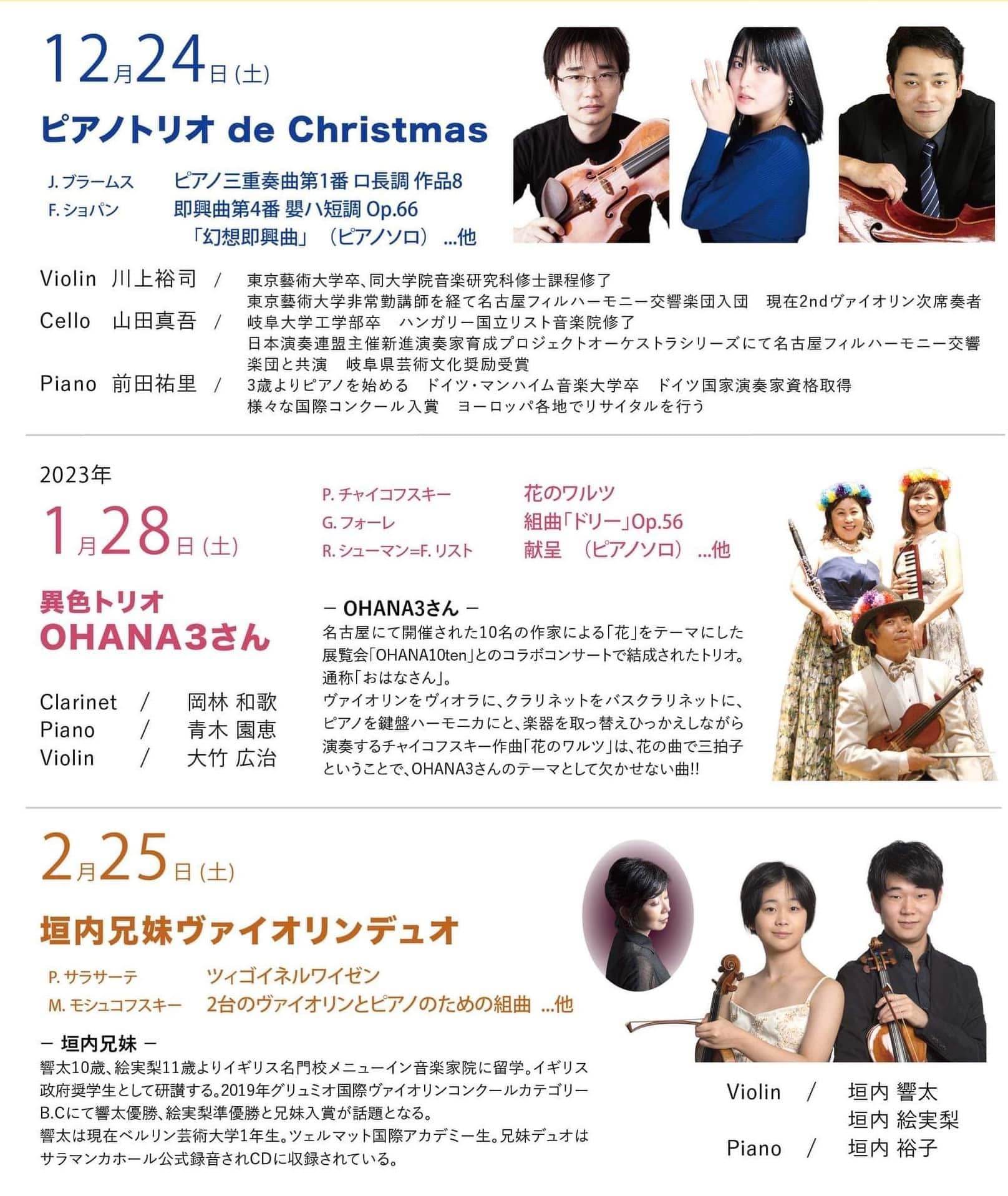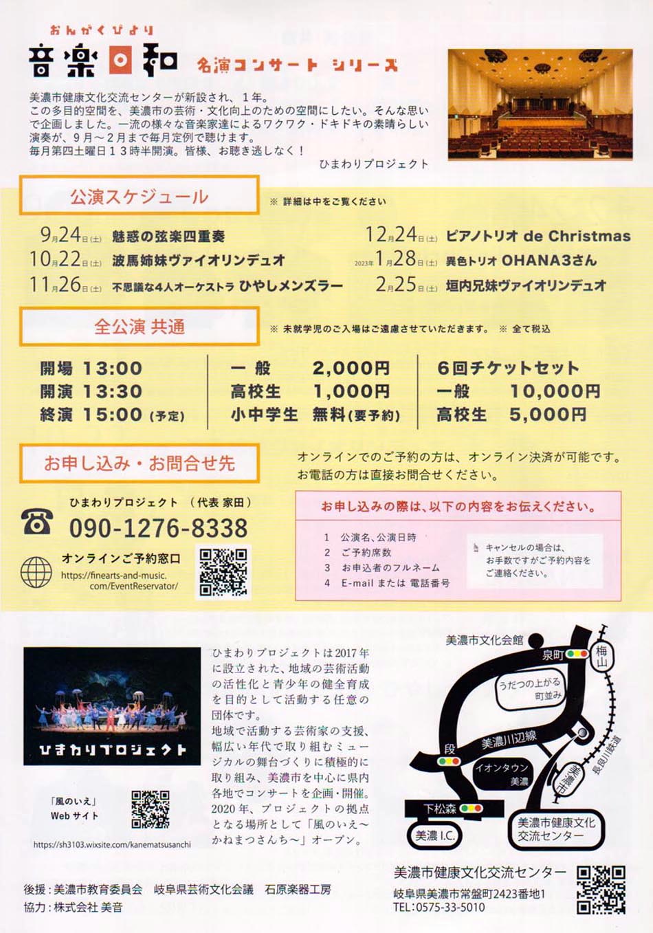 1/28(土) 美濃市健康文化交流センター多目的ホールにて、ひまわりプロジェクト・美濃市による、音楽日和 名演コンサートシリーズOp.1 にOHANA3として出演します。